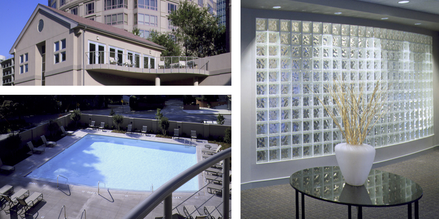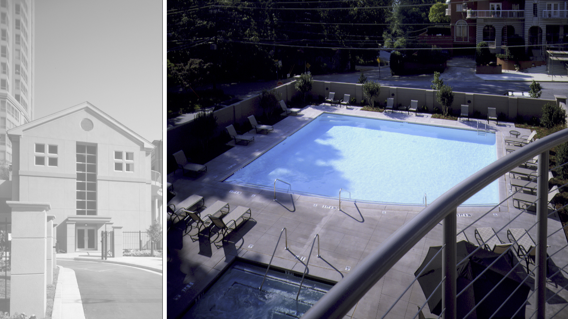 POH+W Architects uniquely configured this design to suit the sloping site. With the upper level connected to the garden, the pool cabana welcomes visitors into the lobby, provides access to the pool, and features a deck that offers views of the pool deck from above. Complete with a small bar, the party space flexibly hosts events and gathering.