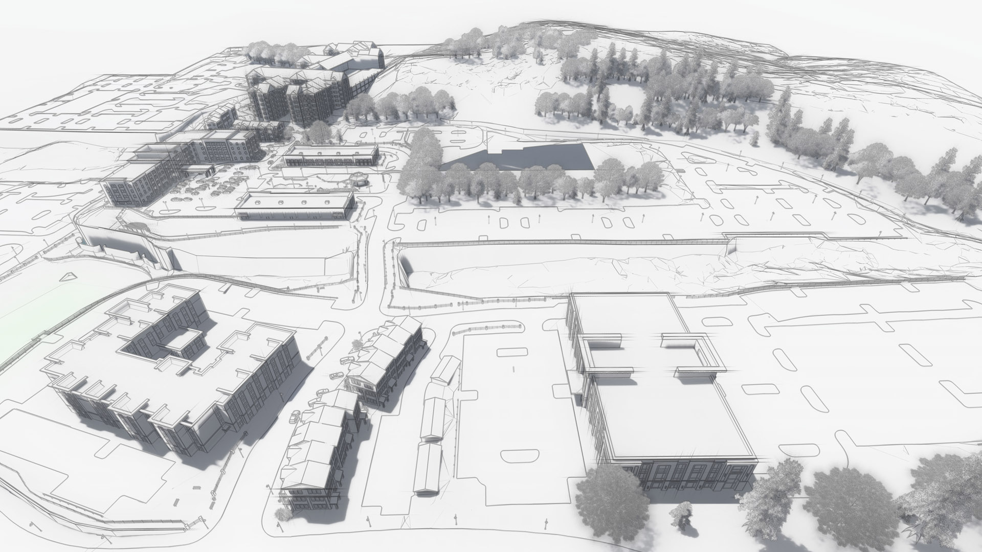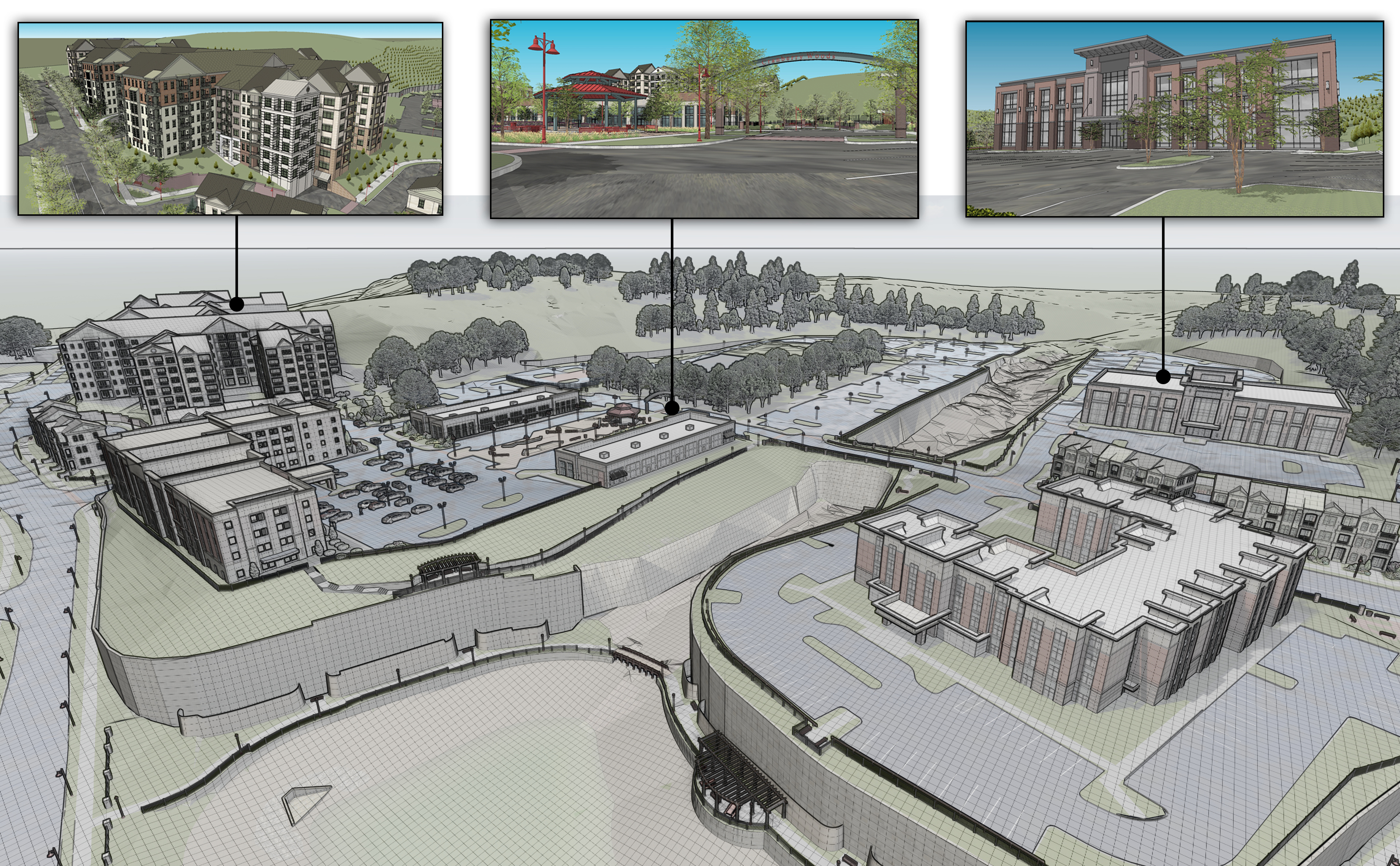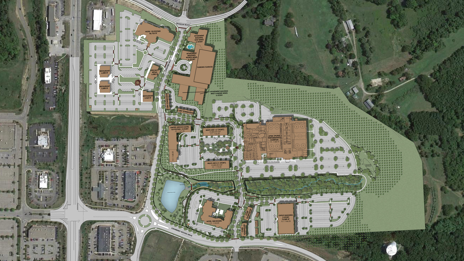 Central to the design and development of this project is the general compliance with the Community Charactor Development (CCD) District Corridor Overlay approach. Features of the CCD design incorporated into this development include common/open spaces that link various use types as well as tree and sidewalk lined streets, pedestrian “pockets” that encourage a variety of social opportunities, a “walking trail” system that links to the overall Cranberry Woods Office Park - all provided with the intent of bringing the mixed use development into a pedestrian friendly scale. The 57.11 acre site will also include 3 hotels, a three-story, 75,000 s.f. office building, 2-10,000 s.f. multi-use single story buildings and the UPMC/Pittsburgh Penguins Sports Medicine and Practice Facility.