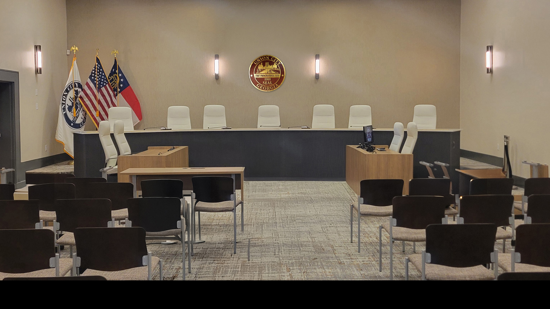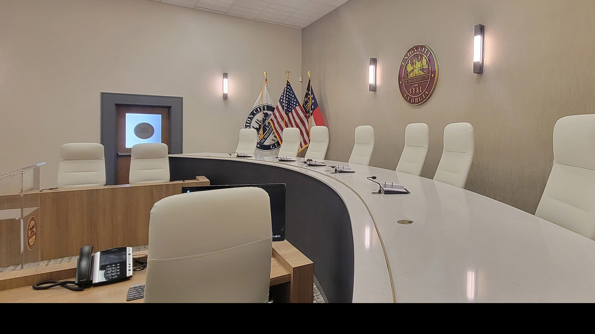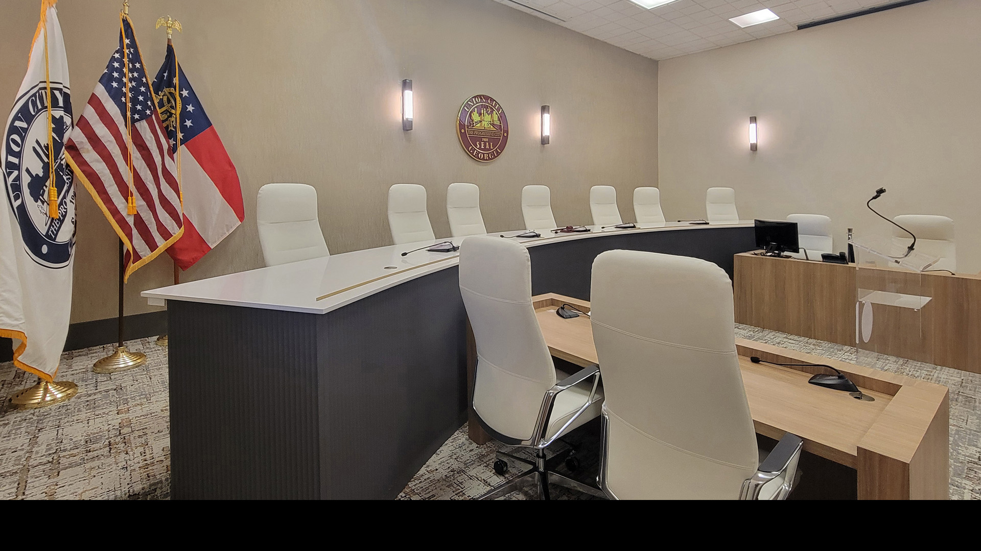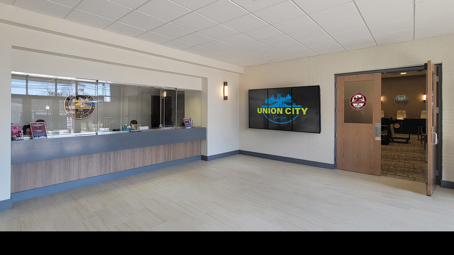 POH+W Architects completed a 13,000 SF single-story renovation of the Union City, Georgia City Hall, featuring new finishes and lighting, expanded transaction counters for City Hall and the Utilities Department, a new entrance canopy, and fully renovated and furnished lobby and Council Chambers.
