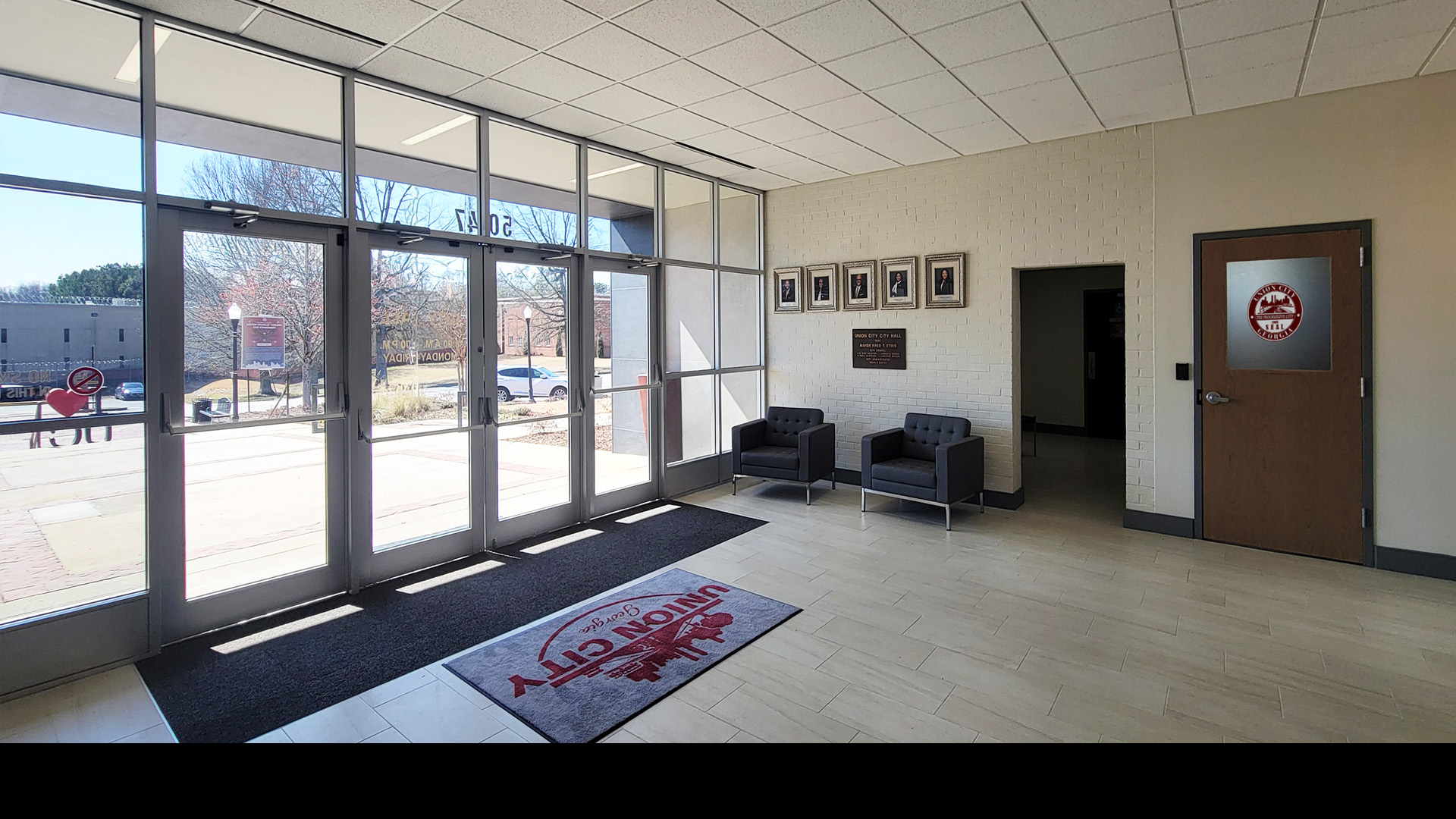 The project modernized the main entrance, customer service areas, City Hall offices, Utilities Department, and Council Chambers through upgraded flooring, paint, electrical systems, custom millwork, roofing, exterior signage, and the new canopy.