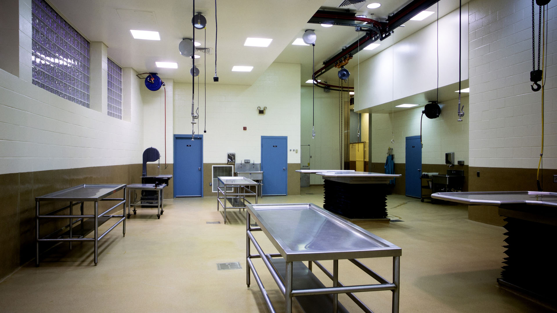 Two cold rooms, a pathological incinerator, and a 3,500-lb capacity monorail hoist system are unique features within these labs. The project was completed on schedule and within 1/4 of 1 percent of the firm’s cost projection.