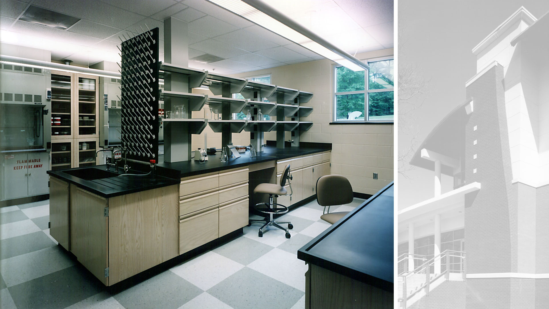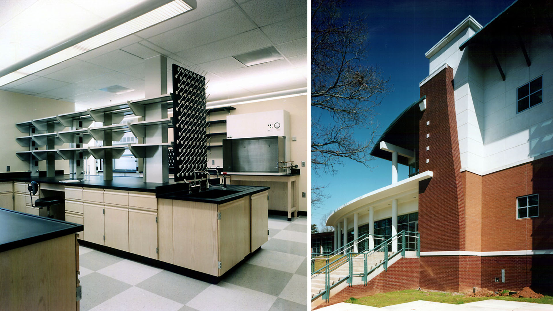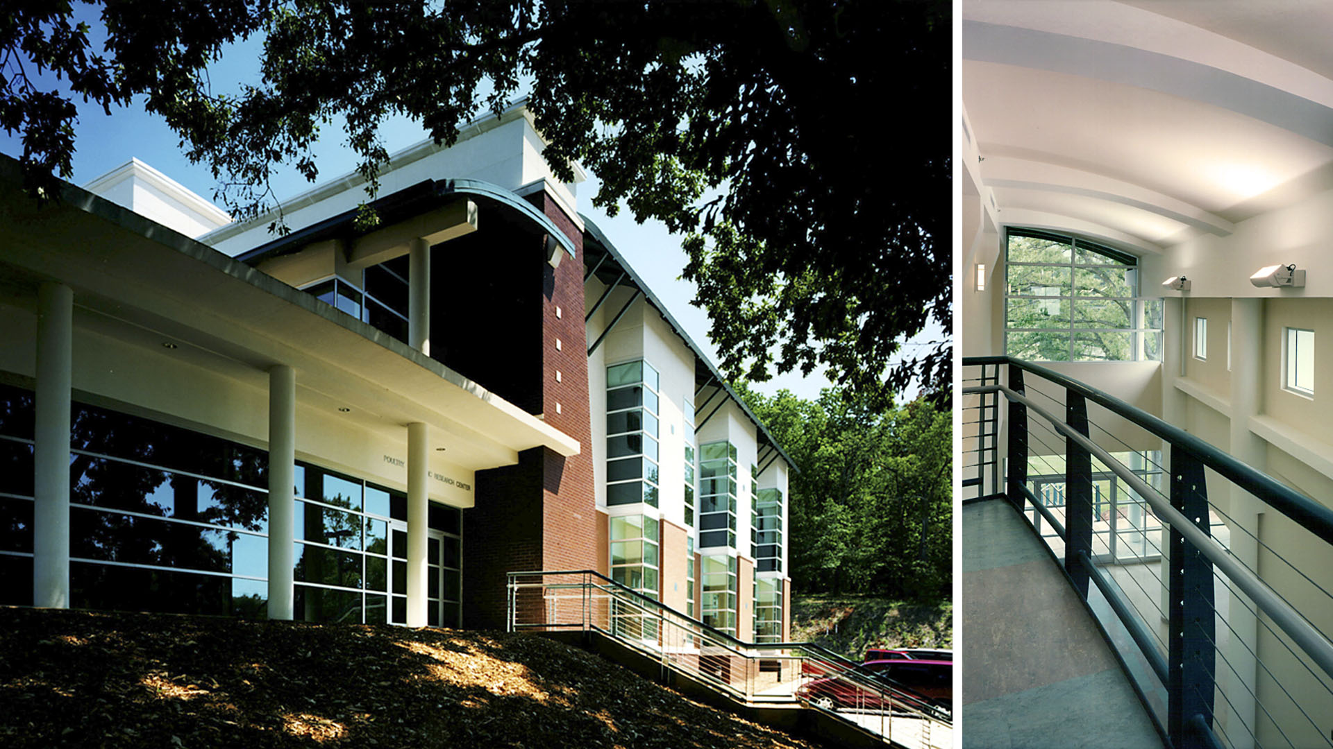Natural daylight is provided to every space in the building in unexpected ways. Clerestory windows and floor to floor corner glass windows provide each lab module with ample daylight. A stylized chicken figure keeps watch over the new entrance into the 2-story lobby.