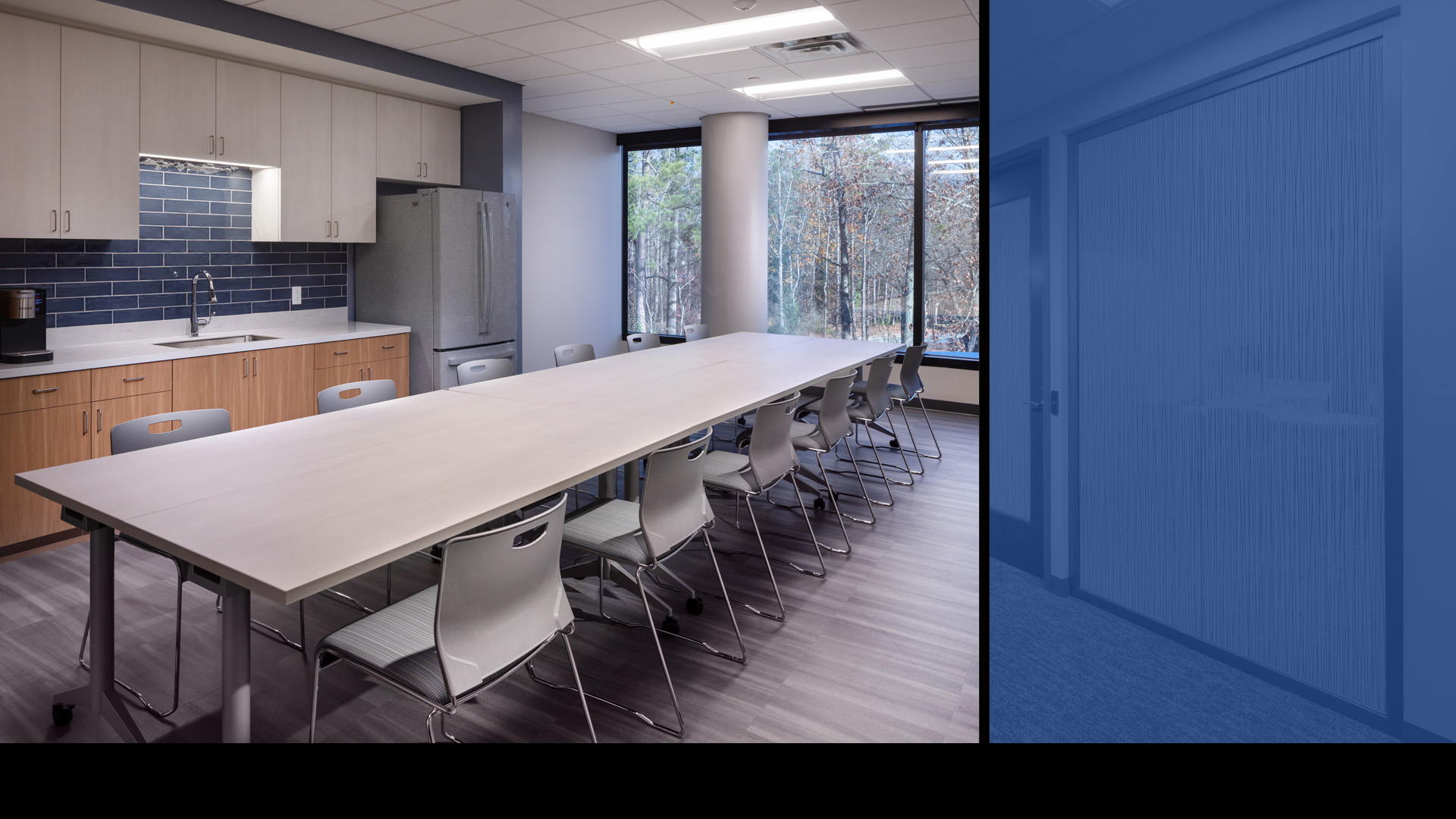 Acoustics were a key design focus, with sound transmission between spaces minimized through thoughtful wall and ceiling detailing and the use of acoustical products. The scope also included a light exterior update, giving the building a more modern office appearance.