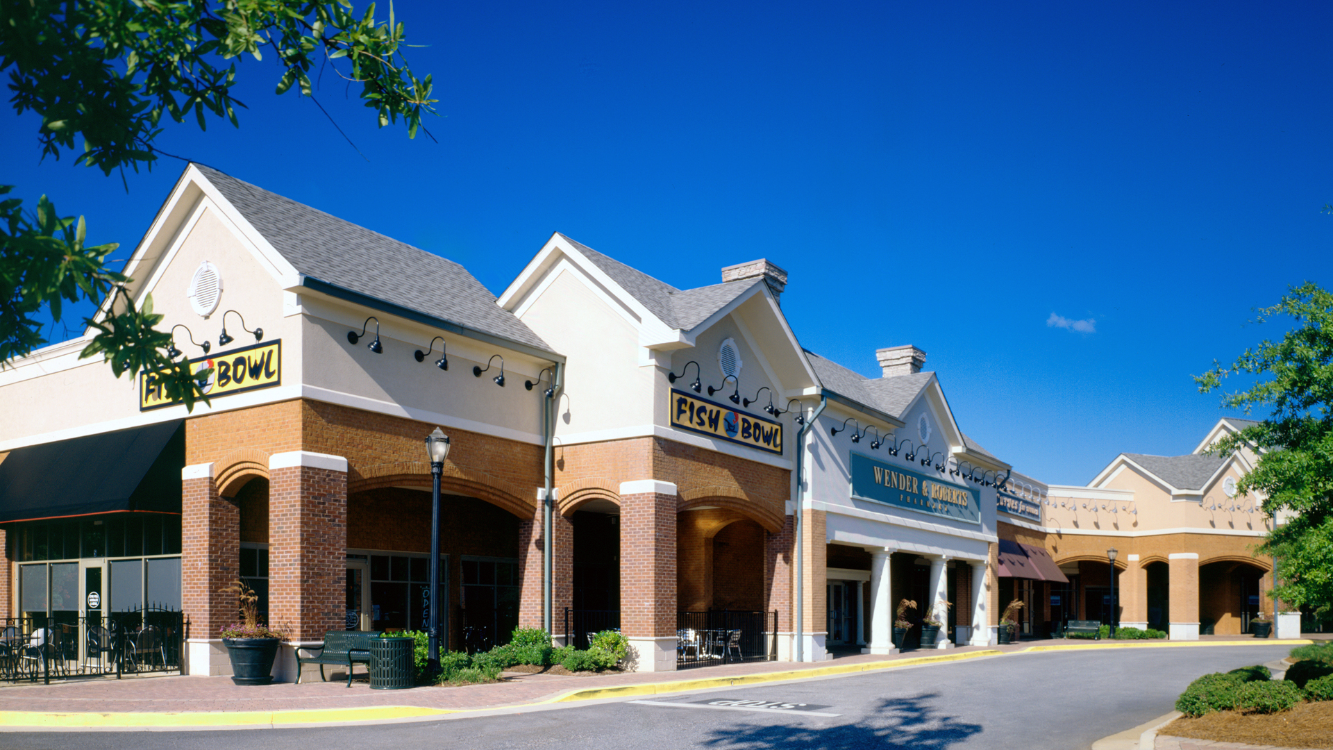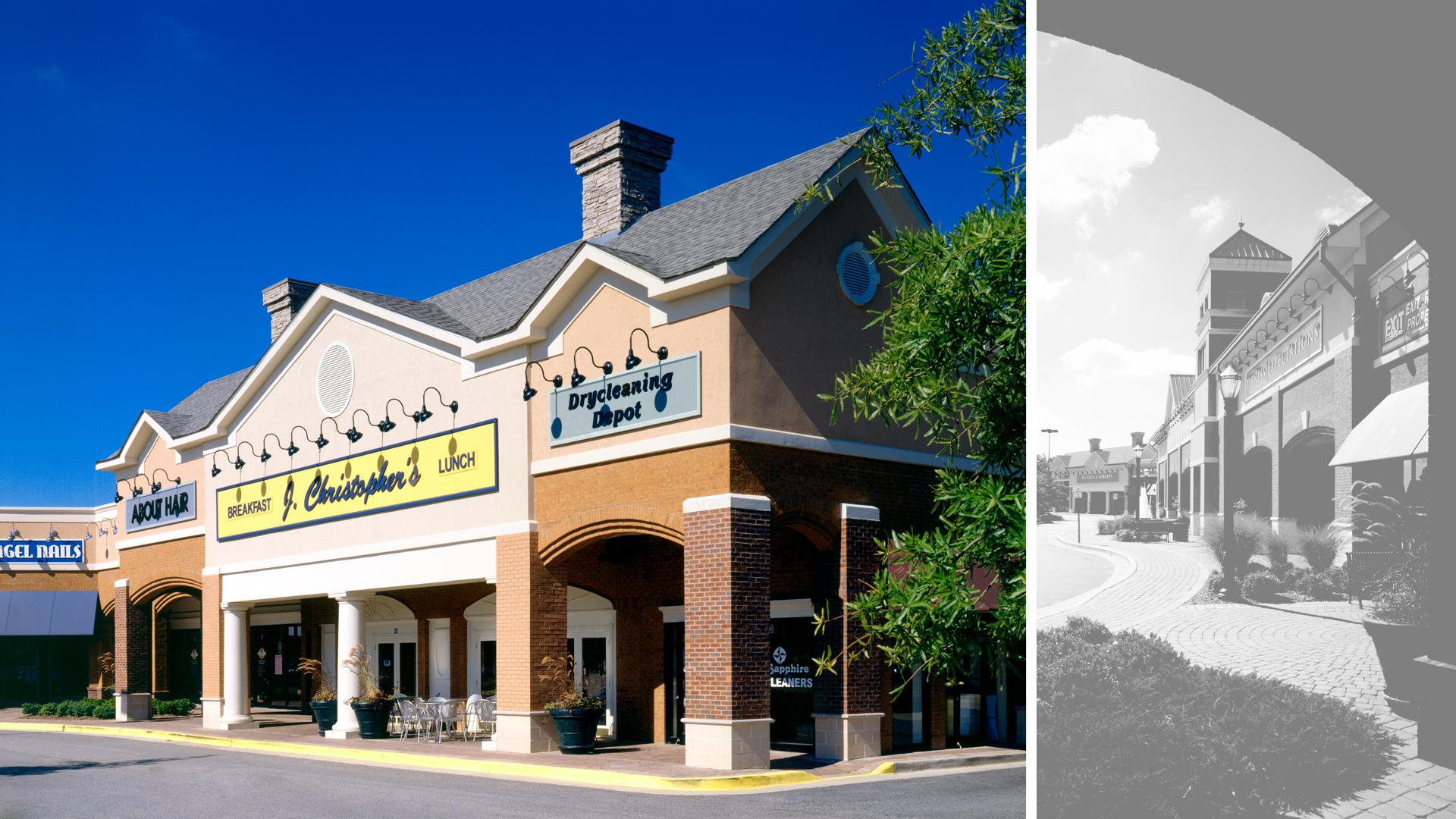 Located in the Village District of Historic Roswell, the revitalized center has tree-lined walkways along a pedestrian plaza. A sign band and pitched roof was added for much needed height.