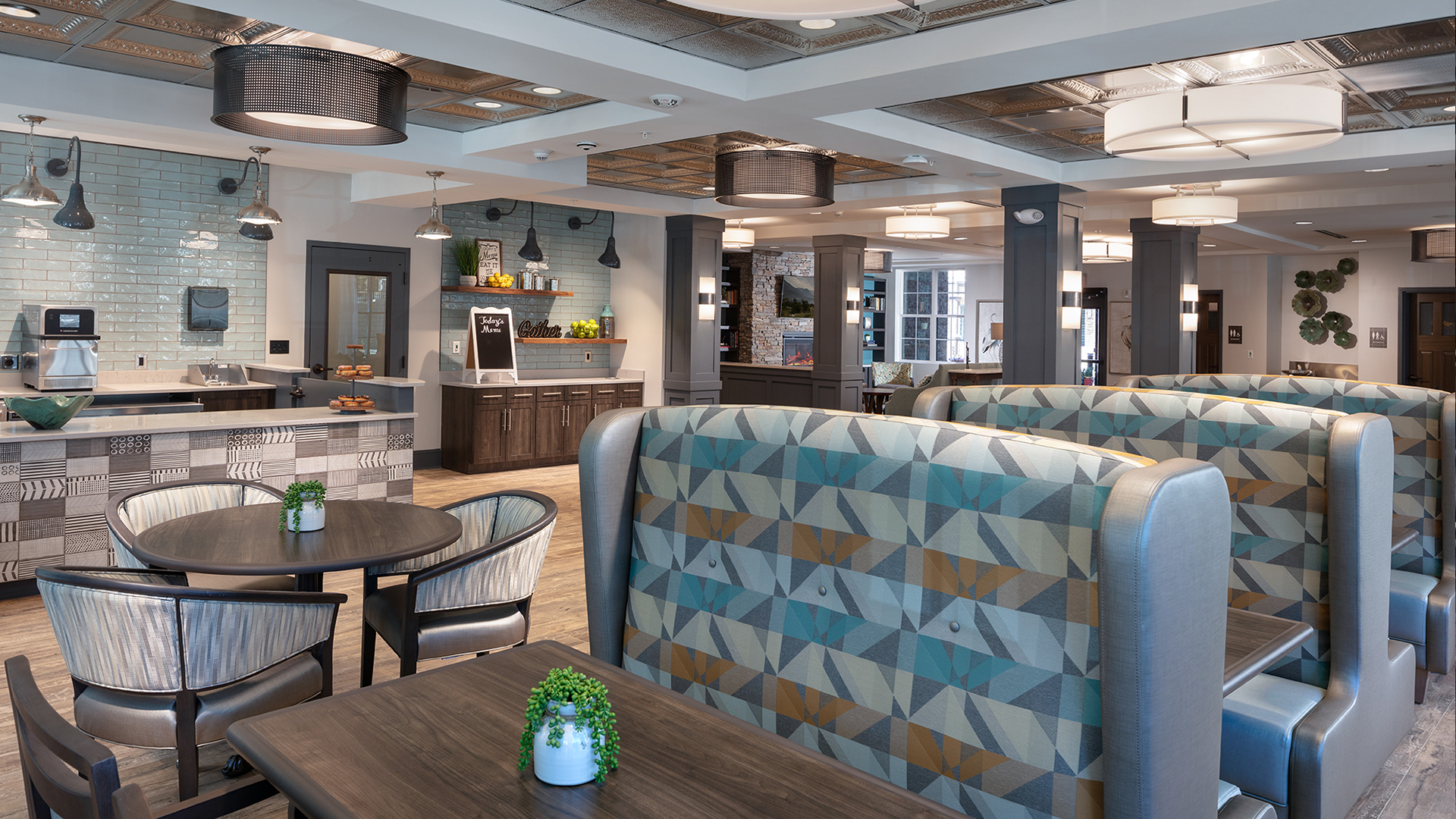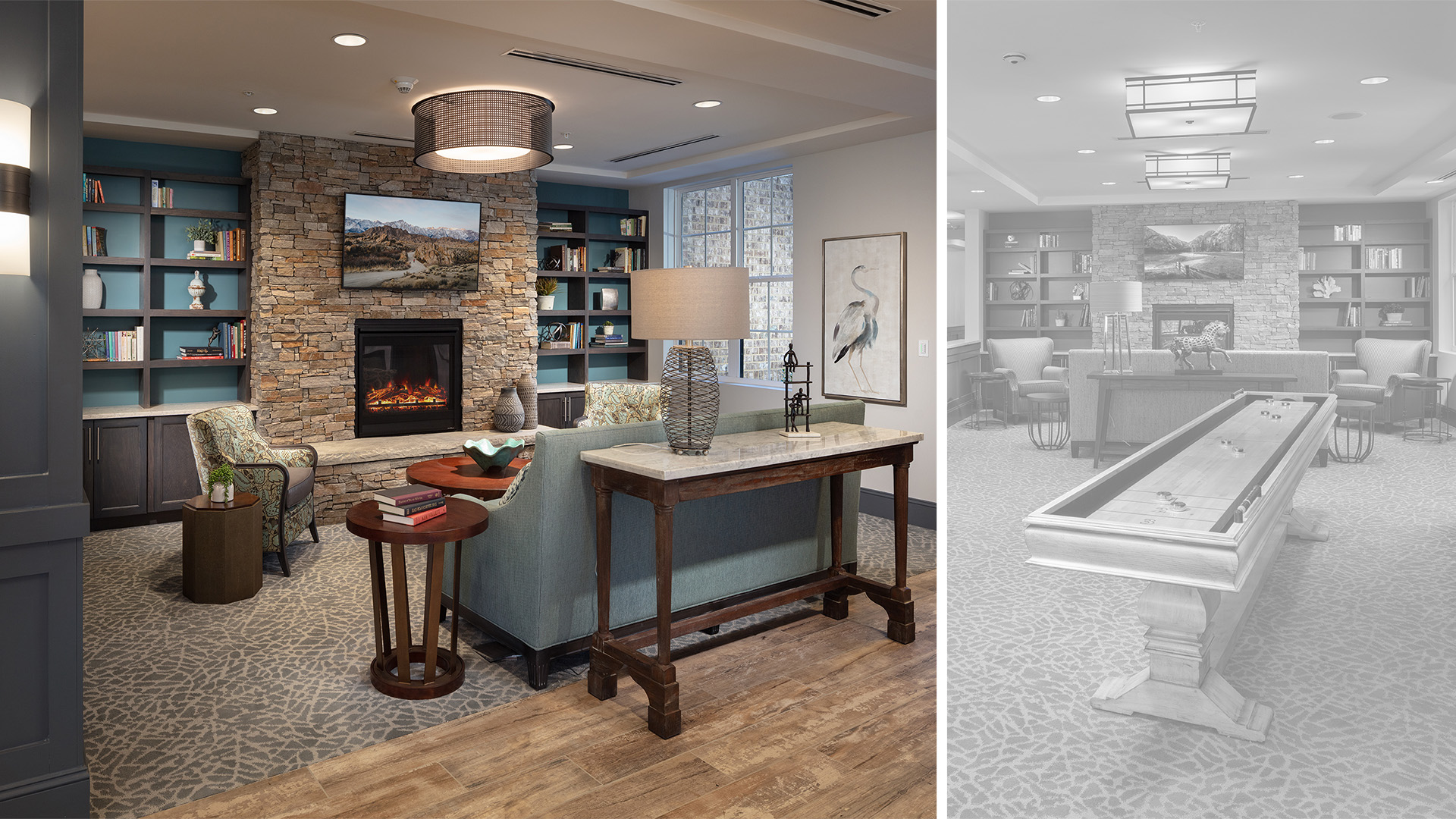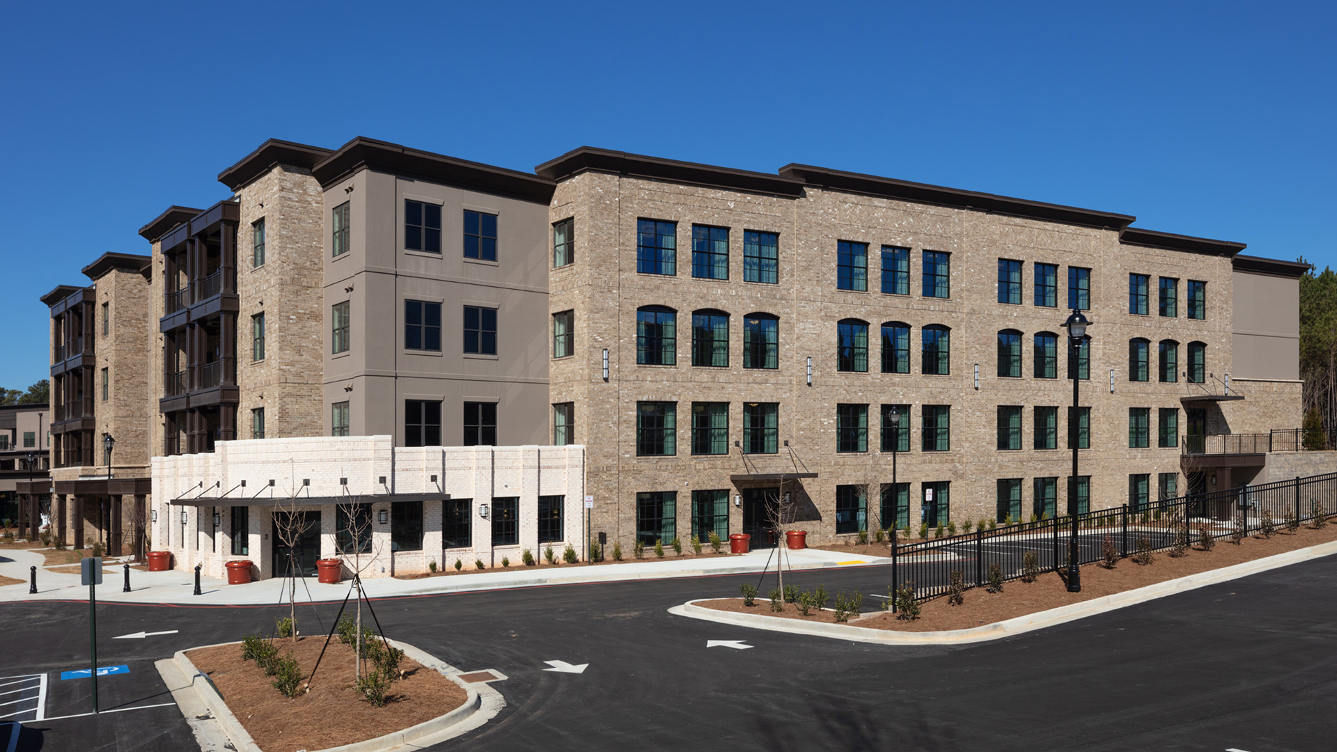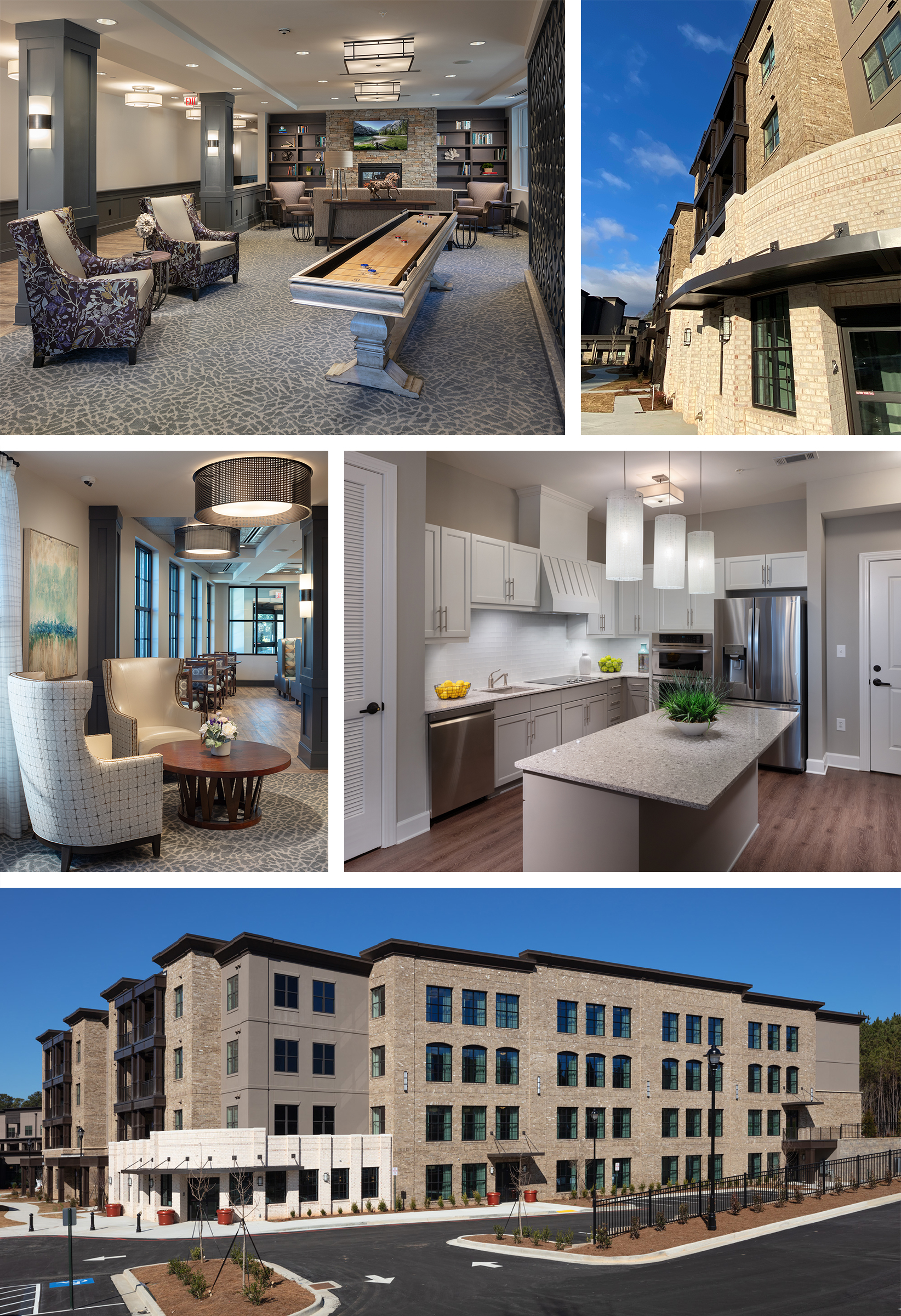 POH+W Architects designed a four-story senior living expansion project located in Alpharetta, GA. The expansion accommodates 12 one-bedroom units and 51 two-bedroom units. Each unit features the latest home design and finish trends. All ground floor units are designed to function as “City Homes”. A bistro dining experience with a cozy fireplace is located on the ground floor while the upper floors offer large gathering spaces for reading, games, and fellowship. An on-site florist shop provides floral arrangements and gifts for guests and residents. A sunroom was created to feature an open, airy space with lots of natural light and seating for residents to enjoy the “Living Wall” of seasonal plantings.